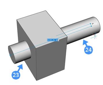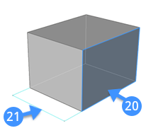 次の図は、押し出しツールの統合オプションを使用する前と後の状況を示しています。ソリッドの表面が強調され(20)、左右の面の間の距離は位置合わせライン(21)で示されています。新しいボリュームは最初のソリッドと統合(22)されます: