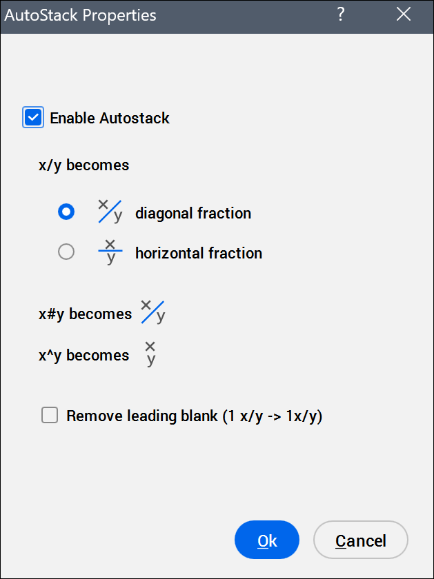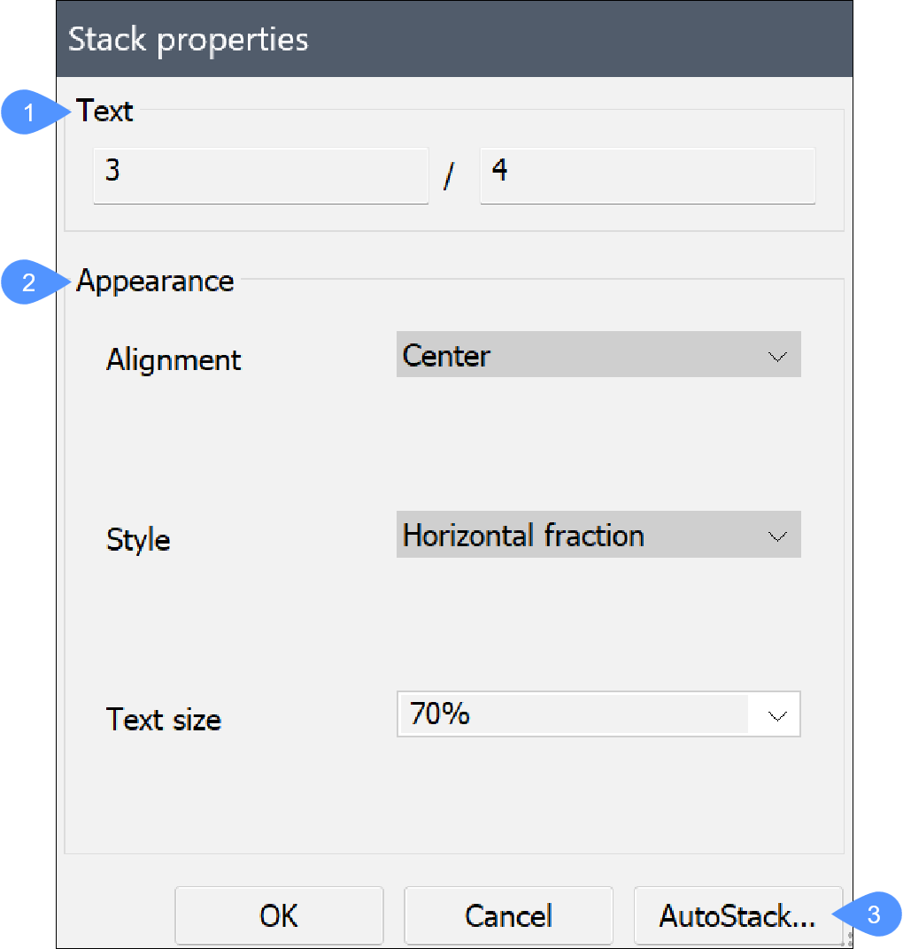 - オンにすると、スラッシュ(/)、シャープ(#)、キャレット(^)で繋いだ2つの数字を自動的にスタックします。注: 設定は、MTEXTAUTOSTACKシステム変数に保存されます。