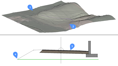 - TINサーフェス(1)、3Dアライメント(2)、コリドーテンプレート(3)、テンプレート要素点に追加したサーフェスターゲット(4)を含む図面ファイルを開きます。注: 図の例では、盛土の終点を表すテンプレート要素点にサーフェスターゲット(4)を追加しています。