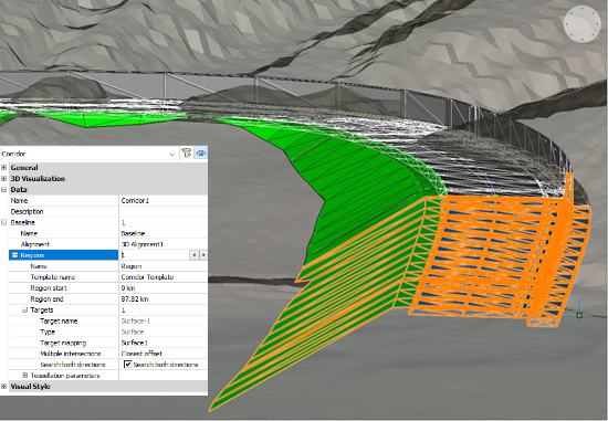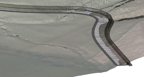 CORRIDORコマンドでは、コリドーテンプレートに基づいて、特定の地形面上の3Dアライメントに沿ったコリドーを作成することができます。