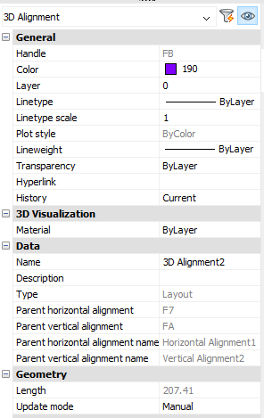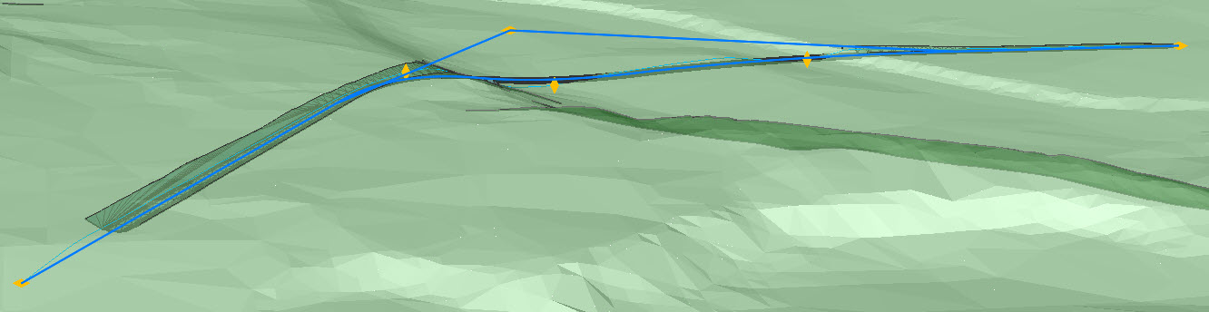 - コリドーを垂直方向に編集するには、コリドーが参照している3Dアライメントを選択して、プロパティパネルを開きます。更新モードを手動に設定します。追加のグリップポイントが表示されます。