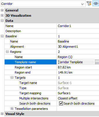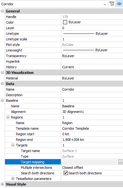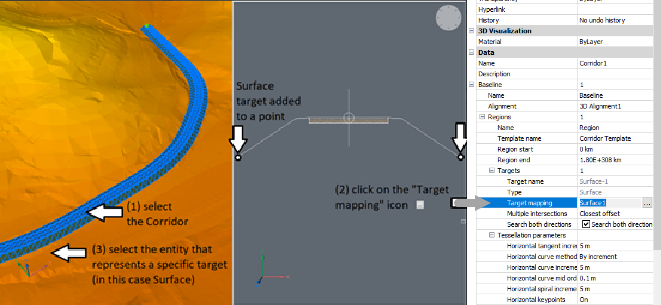 個々のコリドーテンプレート要素のジオメトリが、特定のサーフェス、水平または垂直のオブジェクトに準拠しなければならない場合、ターゲットが作成され、コリドーテンプレート要素の対応する点に追加されます。以下のターゲットタイプを定義することができます。サーフェス、水平、垂直の各ターゲット。