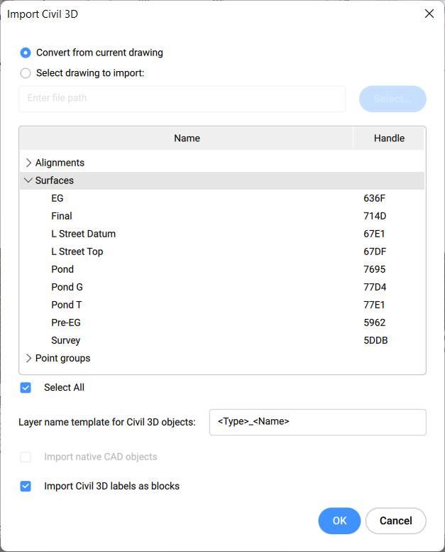 3. Civil 3D読み込みダイアログボックスで、カレント図面から変換を選択します。