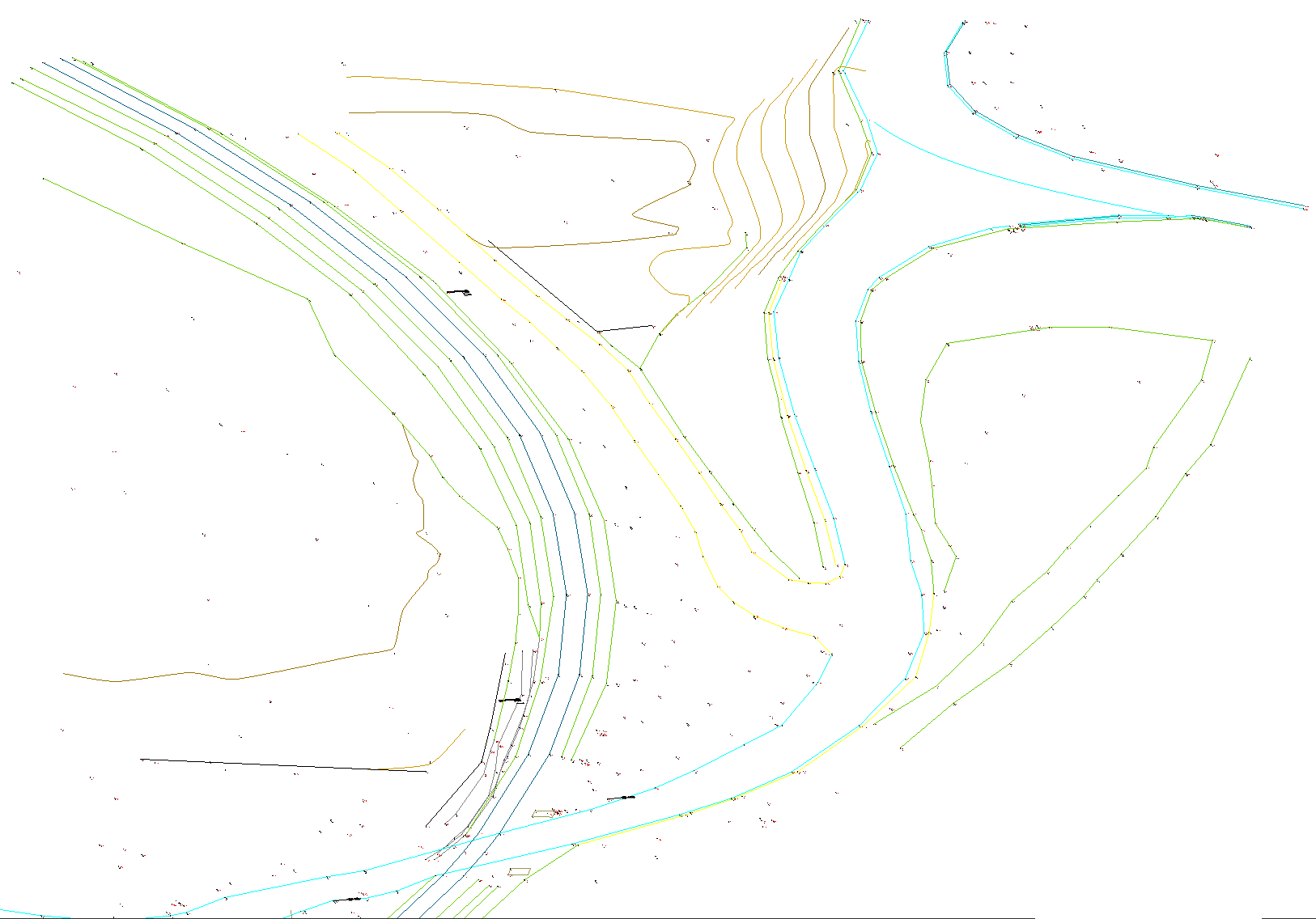 • 破断線は、縁石、擁壁などの線形インフラストラクチャフィーチャーを表します。これらの線は、三角形のエッジも定義します。破断線は、線分、ポリライン、円弧、円などの直線図形から作成できます。