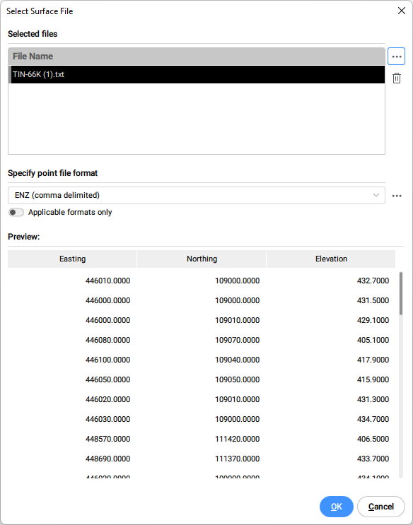 注: サーフェスファイルの形式を管理するには、ポイントファイル形式を指定セクションの参照ボタンをクリックします。