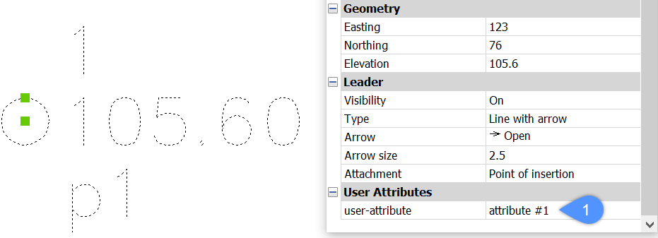 注: 新しいユーザ属性は土木ポイントのプロパティパネル(1)に一覧表示されます。ここで属性値を編集することも可能です。