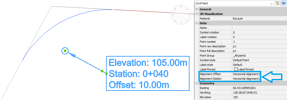 9. プロパティパネルで、適切な土木オブジェクトを選択してプロパティ値を確認し、土木ポイントラベルスタイルに表示します。