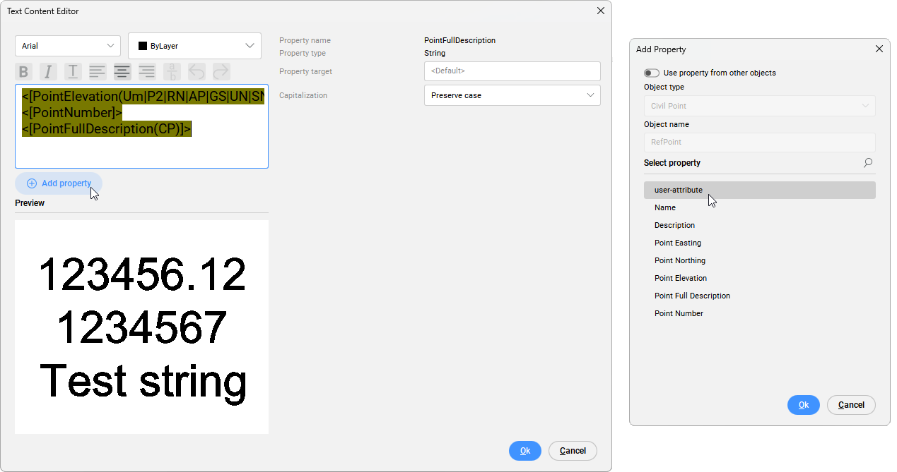 注: プロパティを追加ダイアログボックスでは、土木ポイントのプロパティを選択でき、また別のオブジェクト(サーフェス、平面線形、縦断線形)のプロパティを使用することもできます。詳細については、文字コンテンツ編集ダイアログボックスの記事を参照してください。
