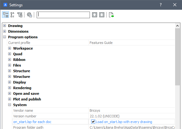 プログラムの自動起動を有効にするには、ACADLSPASDOCシステム変数を1に設定するか、設定 / プログラムオプション / システム でオプションを切り替えます。
