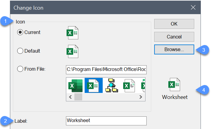 アイコンを変更ダイアログボックスでは、OLE Frame図形を図面に挿入する前に、そのアイコンを変更することができます。アイコンは、ドキュメントタイプに関連付けられ、ソースアプリケーションで定義されます。