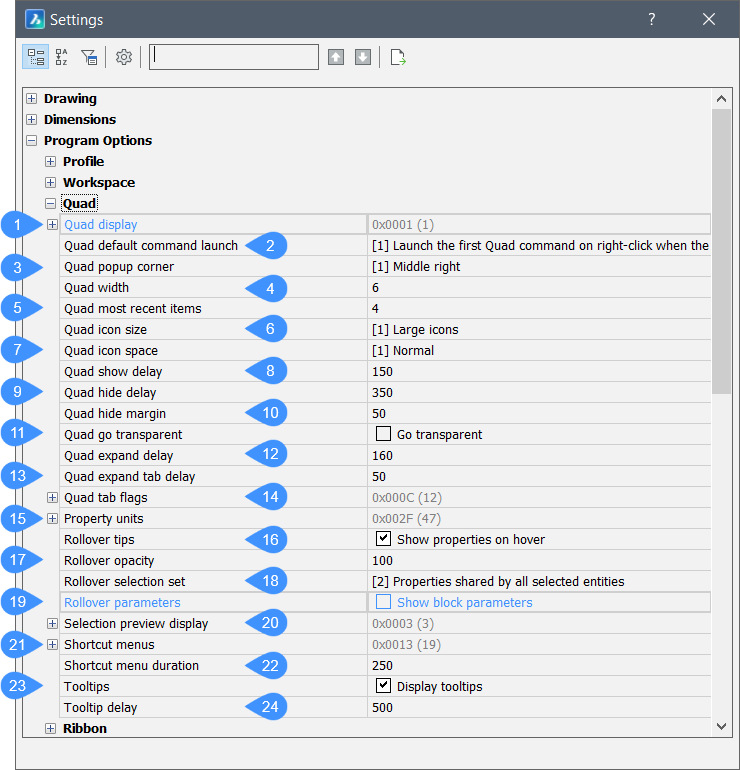 - ROLLOVERTIPSシステム変数は無視され、図形プロパティは表示されません(クワッドは表示されません)。