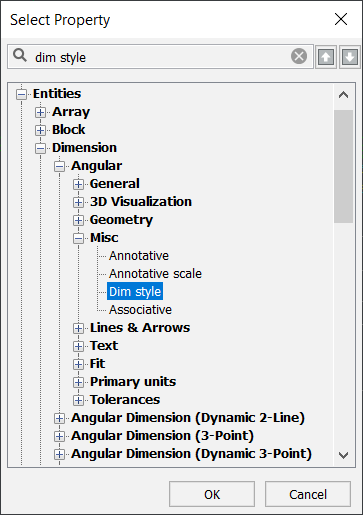 - プロパティの選択ダイアログボックスの検索欄に、「dym style」と入力します。次を検索ボタン(