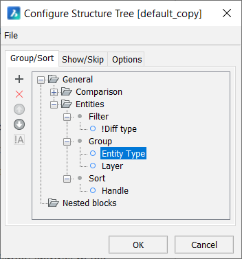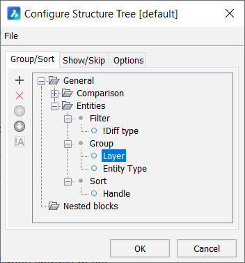 構造パネルでは、原則として図形プロパティの値が比較されます。比較プロセスのルールは、 構造ツリー設定ファイル(CST)に保存されます。図形は、比較結果により構造ツリー上でグループ化されます。図形がグループ化されていると、同じプロパティ値を持つ図形を選択したり、図面が意図したとおりになっているか確認したり、プロパティを変更したりすることが簡単にできます。