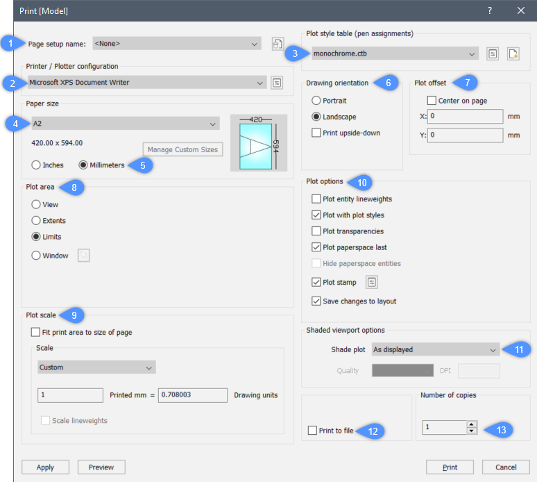 • モデル空間を印刷する場合は、シェード印刷モードを選択します。(11)