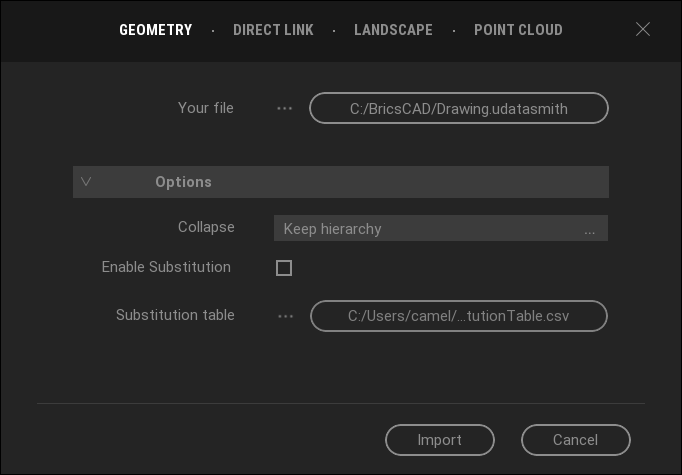 読み込みダイアログで、Unreal Engine(*.udatasmith)モデルファイルを選択します。