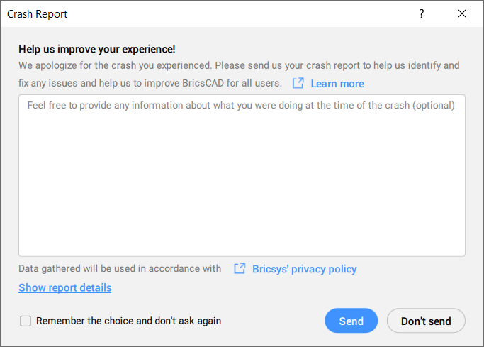 注: クラッシュレポートダイアログボックスは、BricsCAD Analyticsプログラムの参加ユーザには表示されません。この場合、BricsCAD Analyticsプログラムダイアログボックスでアプリケーションデータとコマンドデータ共有オプションを有効にしておくと、クラッシュレポートが自動的に送信されます。