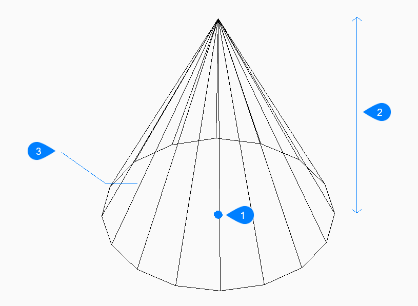 円錐または楕円錐の形状をした3Dポリゴンメッシュを作成します。中心、半径、直径、高さ、軸の端点、頂点、分割数などのオプションを組み合わせて選択できます。
