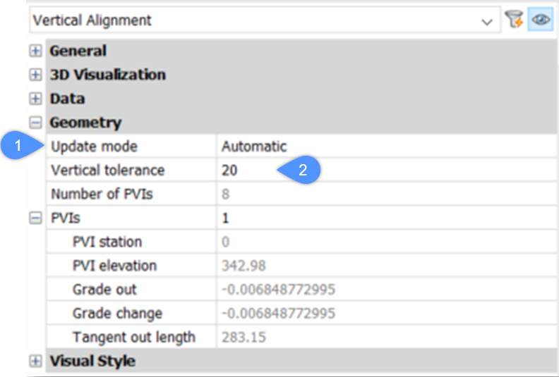 縦断線形を作成すると、プロパティパネルの垂直公差(2)パラメータの値を編集することができます。