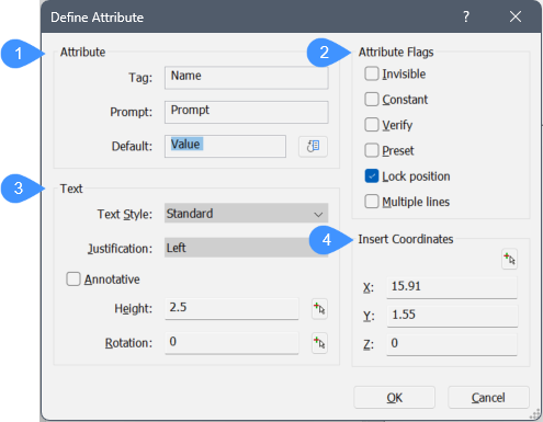 属性の名前を指定します。これは、BricsCAD®が属性を識別するための名前です。最大255字までの文字、数字、句読点を使用できます。
