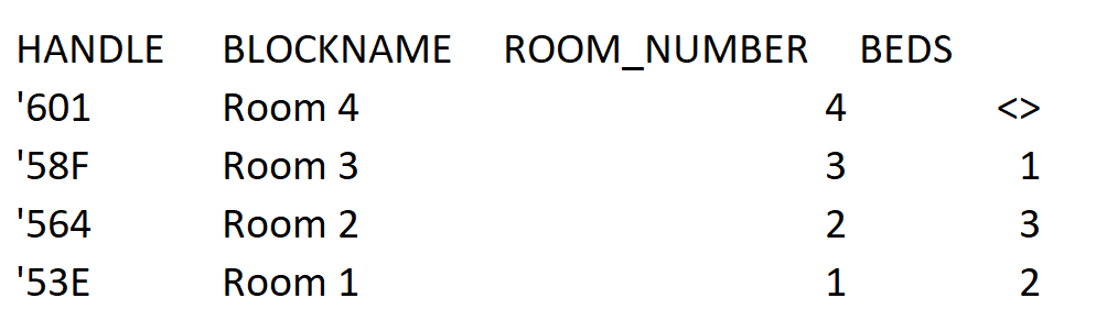 ATTOUTコマンドの出力は.txtファイルです。このファイルには、選択したブロックの情報が順番にテーブル形式で示されています。HANDLE列とBLOCKNAME列にはブロックのハンドルとブロック名が示され、追加の列にはブロック属性の値が示されます。各行は、ブロック参照とその属性の値を表します。
