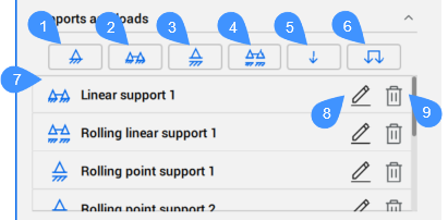 - 追加したすべての支持と荷重の一覧です。個別に編集または削除することができます。注: 支持や荷重を追加または編集するときはコマンドのコンテキストパネルが閉じて、コマンドラインからオプションを選択することができます。