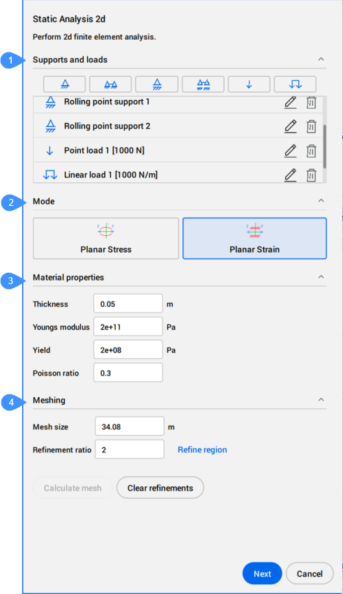 最初に、閉じた2D境界線または3D平面を選択すると、2D静的解析コマンドのコンテキストパネルが開くので、材料特性や物理パラメータ、荷重と支持、入力境界のメッシュを定義します。準備ができたら解析を実行し、解析結果を視覚的に検査・分析します。