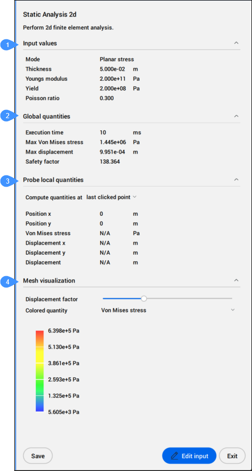 ワールド座標系のXY平面にある閉じた2D境界線または3D平面に対して、2D有限要素解析を実行します。