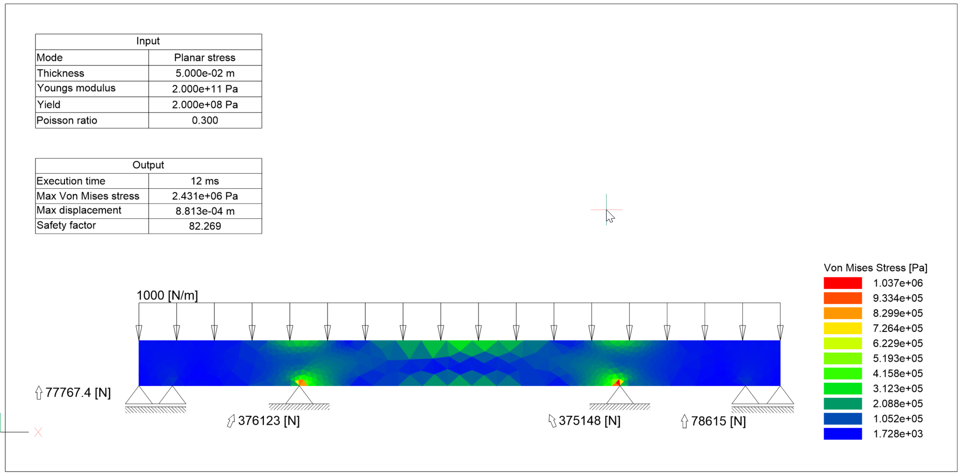 材料特性と物理パラメータには、ヤング率、ポアソン比、降伏値、厚さがあります。荷重には点圧と線圧、支持には点支持と線支持があります。解析結果は、入力値の概要、グローバル出力値(実行時間、最大ミーゼス応力、最大変位、安全係数)、変位やミーゼス応力のカラーメッシュが表示されます。