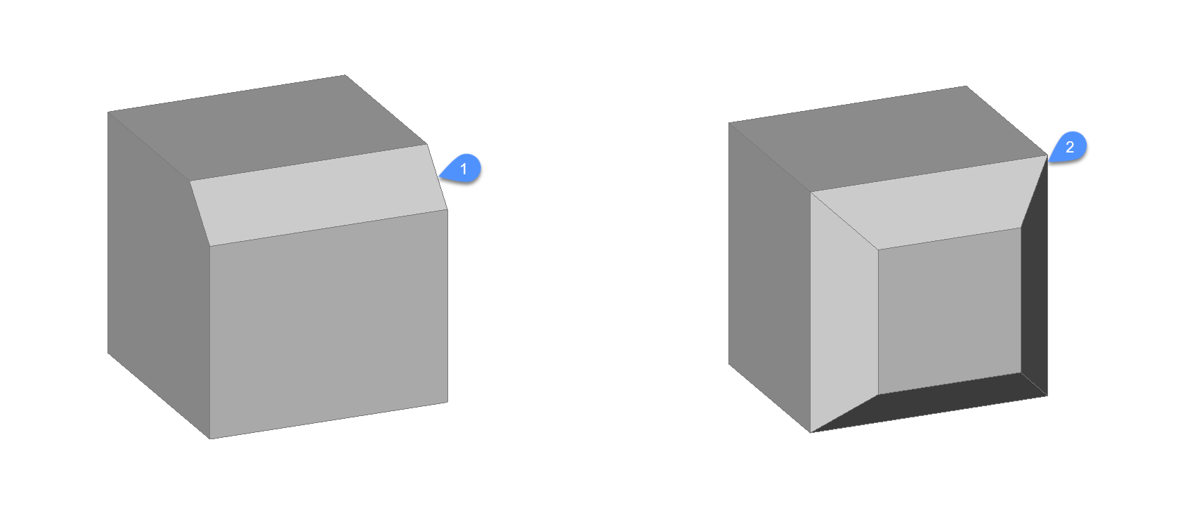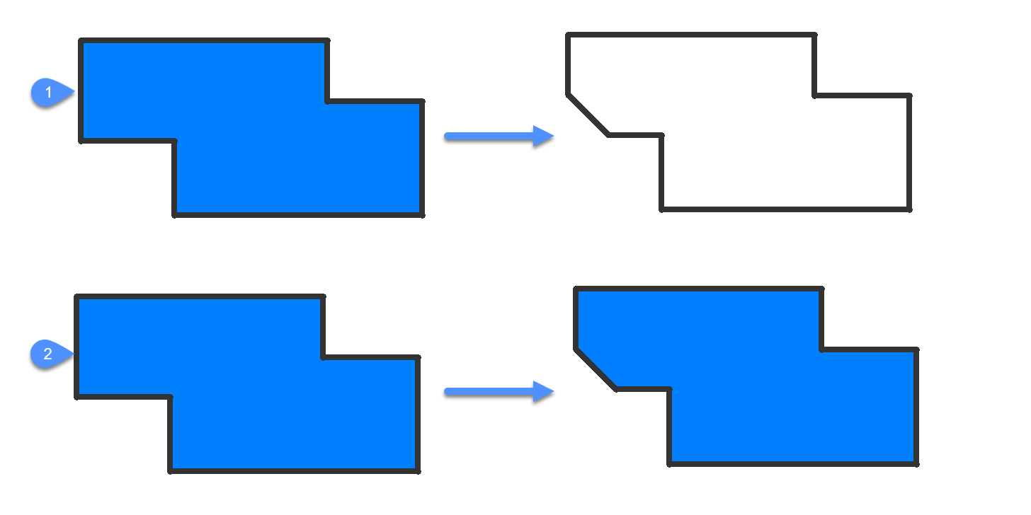 - 選択したポリラインの2つのセグメントが交わる頂点を面取りします。(該当する場合)注: 線分で作成したハッチングの境界に面取りを作成すると (1)、ハッチングの関連付けがが解除されます。境界がポリラインで定義されている場合、関連付けは維持されます (2)。