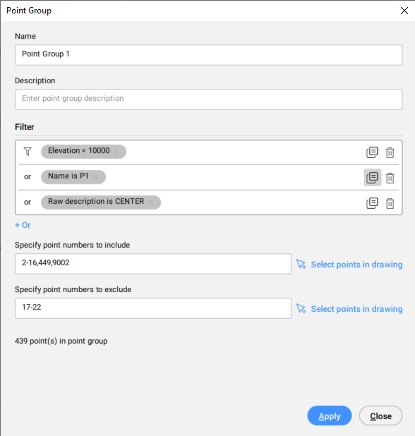 - 選択したポイントグループにポイントを含める(または除外する)ための条件を指定するための新しいフィルターを作成したり、既存のフィルターを編集したりすることができます。注: フィルターを追加、複製、削除できます。注: 特定の図面に個別のフィルターを作成すると、その図面に後から挿入されるすべてのポイントにも影響を与えます。