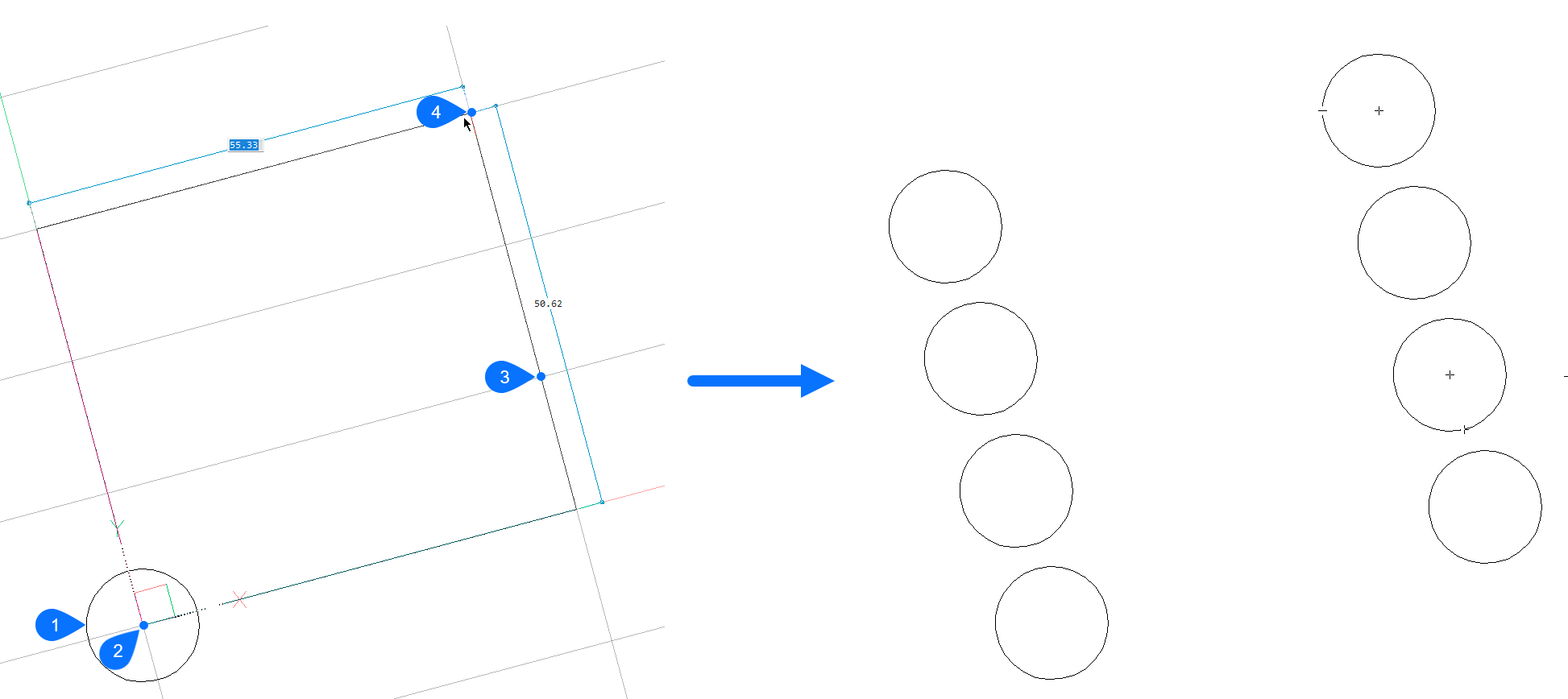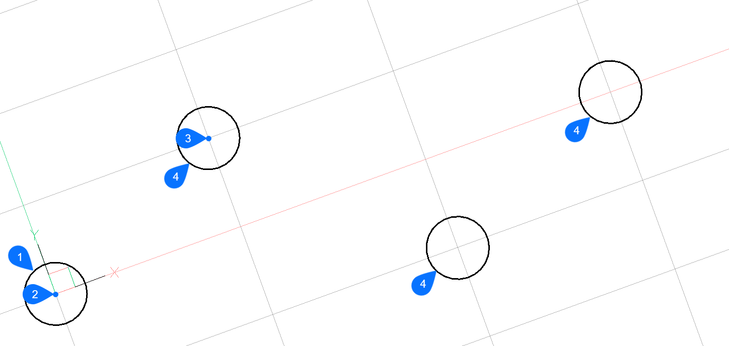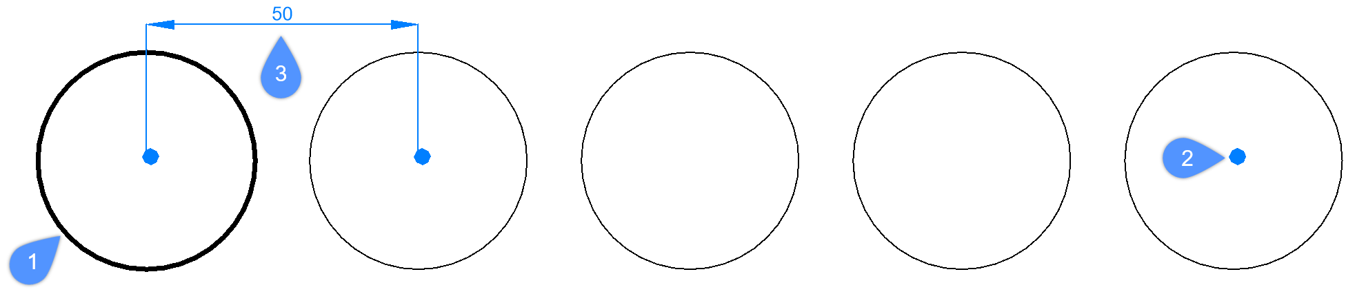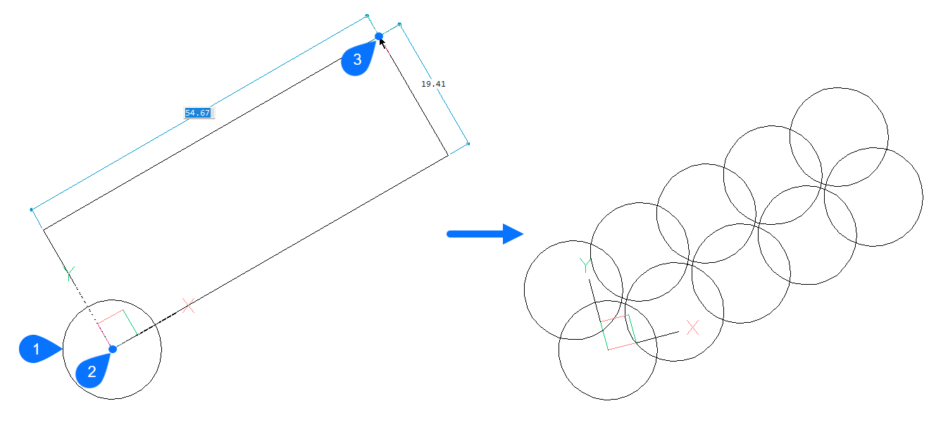 - 計測終点(2)とコピー間の距離(3)に基づいた数だけ、元図形のコピー(1)を作成します。