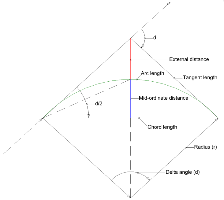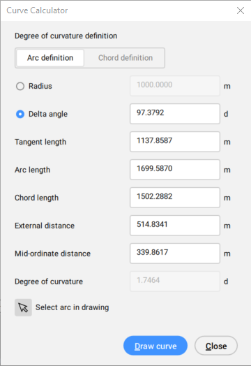 円曲線の角度円弧の定義によって定義されます。すなわち、円曲線の角度が円弧によって決まります。このオプションは、円曲線の角度が、100単位の円弧の角度に対応する道路曲線でよく使用されます。
