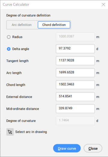 円曲線の角度弦の定義によって定義されます。すなわち、円曲線の角度が弦によって決まります。このオプションは、円曲線の角度が、100単位の弦に対応する鉄道曲線でよく使用されます。