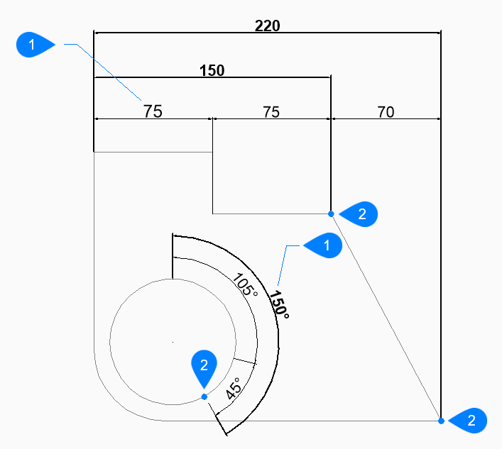 既存の寸法と同じベースラインから、積み重ねた線分、角度、または座標寸法を作成します。寸法は現在の寸法スタイルに基づいており、寸法の間隔はDIMDLI変数で指定されます。