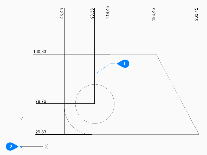 現在の UCS の原点から図面内の指定した点までの X 距離または Y 距離を計測する累進寸法を作成します。寸法は、現在の寸法スタイルに基づきます。オプションを使い、寸法値の角度や内容を指定できます。