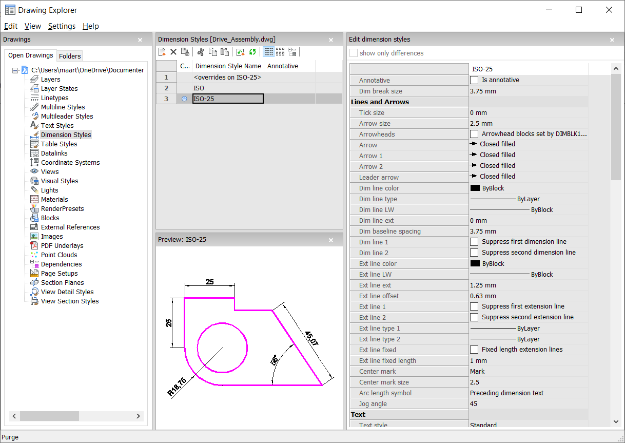 寸法スタイルカテゴリを選択して図面エクスプローラダイアログボックスを開き、カレント図面の寸法スタイルを表示および修正します。