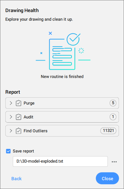 最後のタスクの後、図面のクリーンアップのレポートが開き、検出およびクリーニングされたすべてのアイテムが表示されます。