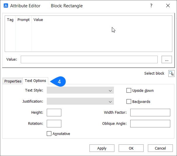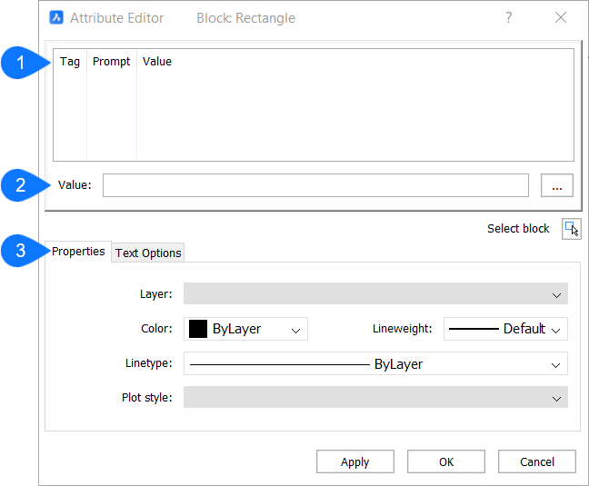 拡張属性編集ダイアログボックスで、1つのブロックに含まれる属性の値とプロパティを編集します。