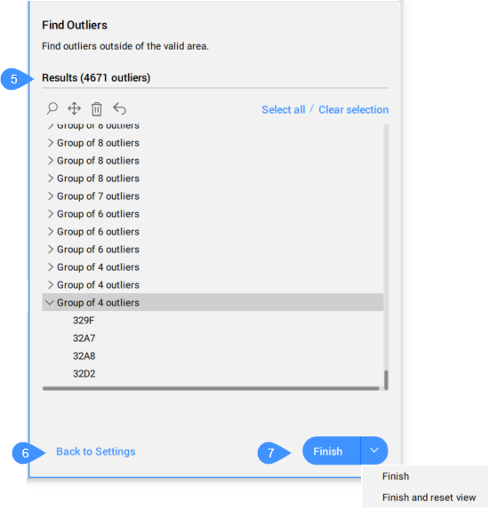 互いに近接している外れ図形は、グループとしてクラスタ化されます。外れ図形のグループを選択すると、グループ内のすべての要素が一度に選択され、ズームインまたは削除することがでます。グループが1つしかない場合、図形は個別に一覧表示され、グループにクラスタ化されません。