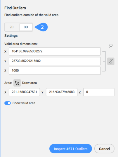 - 図面の有効範囲を設定します。この範囲の外側にある図形は極端な座標にあると見なされ、外れ図形を探すコマンドパネルの結果セクションに一覧表示されます。注: コマンドラインの寸法を変更オプションを使用すると、有効エリアの寸法を設定できます。