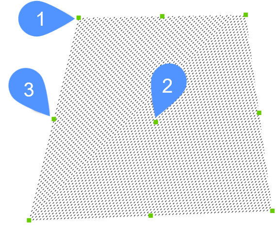 • ハッチングの境界を変更するには、各境界の頂点(1)、または、境界のセグメントの中点(3)をドラッグします。