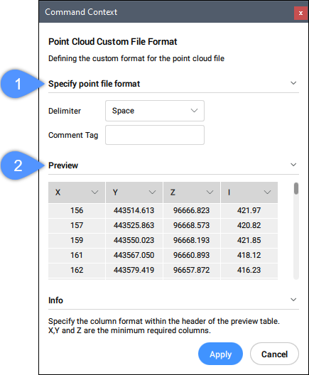 - 点群ファイルのプレビューを表示します。列の形式を構成できます。