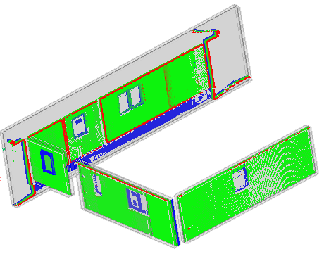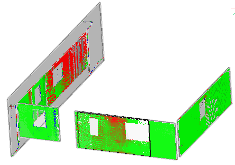 選択された最も近い平面(サブ)図形に対するフィット感を視覚化するために、点群ポイントに色を割り当てます。選択された図形は、コマンドコンテキストパネルが開いている間、クロップを使って分離されます。