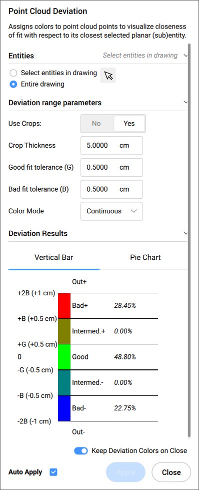 点群を比較する平面サーフェス、TINサーフェス、またはソリッドを選択すると、点群偏差コマンドコンテキストパネルが開き、設定を簡単に変更できます。