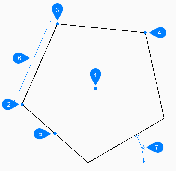 等辺多角形をした閉じたポリラインを作成します。オプションを選択して、中心、辺の数、エッジの長さと角度、中心からエッジの頂点または中点までの距離を指定することができます。