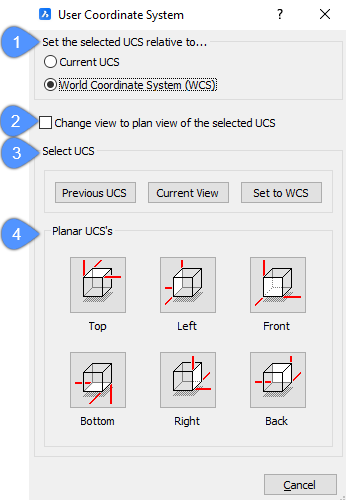 UCSを以下の標準的な直交ビューのいずれかに設定します。いずれかのオプションをクリックすると、プログラムはUCSを設定し、ダイアログボックスを終了します。