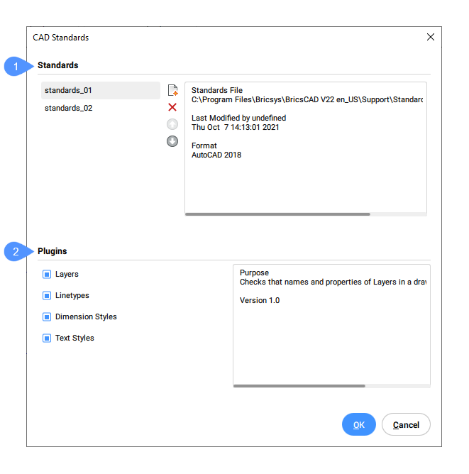 CAD標準仕様ダイアログボックスでは、STANDARDSコマンドのオプションを選択できます。