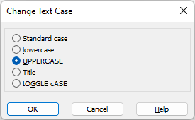 大文字小文字切替ダイアログボックスでは、選択した文字の大文字と小文字を変更できます。標準文字、小文字、大文字、タイトル、大文字・小文字を切替から選択できます。