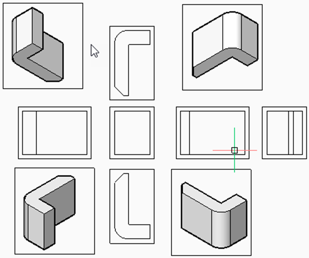 カーソルを移動する場所に応じて、最大5つの投影図と4つのアイソメ図を配置できます。ビューは自動的に整列します。Ctrlキーを押して整列のオン/オフを切り替えれば、シート上の任意の場所にビューを配置できます。