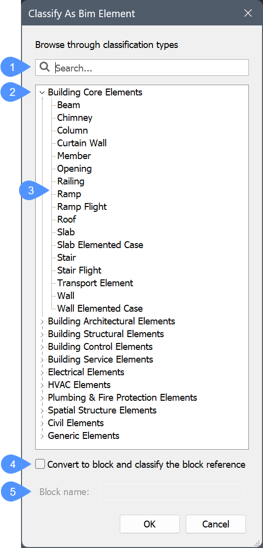 BIM要素として分類ダイアログボックスでは、分類のタイプを指定するか、選択範囲をブロックに変換してブロック参照を分類します。BIMCLASSIFYコマンドでその他オプションを選択すると、このダイアログボックスが開きます。